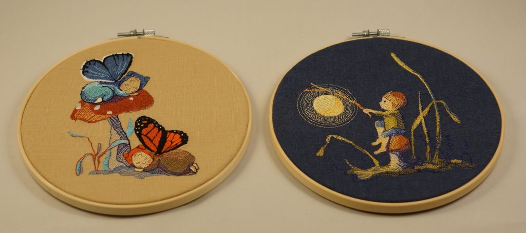 Zum Schluß noch zwei hübsche Stickrahmen-Bilder für jeweils 22 Euro, z.B. als Wandschmuck. Sie haben einen Durchmesser von ca. 20 cm. Die Motive sind von Nadelfein auf Leinen gestickt:
