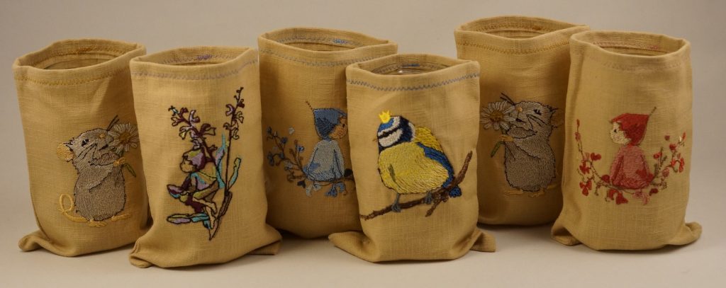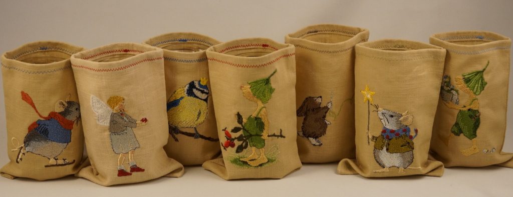 Die bunten Windlichtlein gebe ich für je 12 Euro her, ab 3 Stück je 10 Euro. Die wunderschönen Motive der ca. 17×11,5 cm großen Beutelchen stammen von Daniela Drescher, Nadelfein & Coradesign & wurden auf Leinen gestickt. Sie können im Brief oder zusammen mit dem Glas in einem Paket auf die Reise gehen: